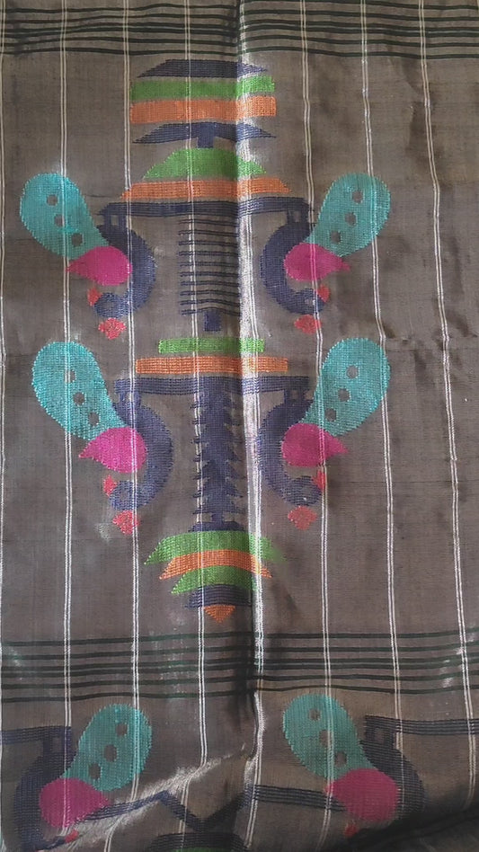 Jamdani Inspired Mud Green Silk Cotton Copper Zari Worked handloom Saree