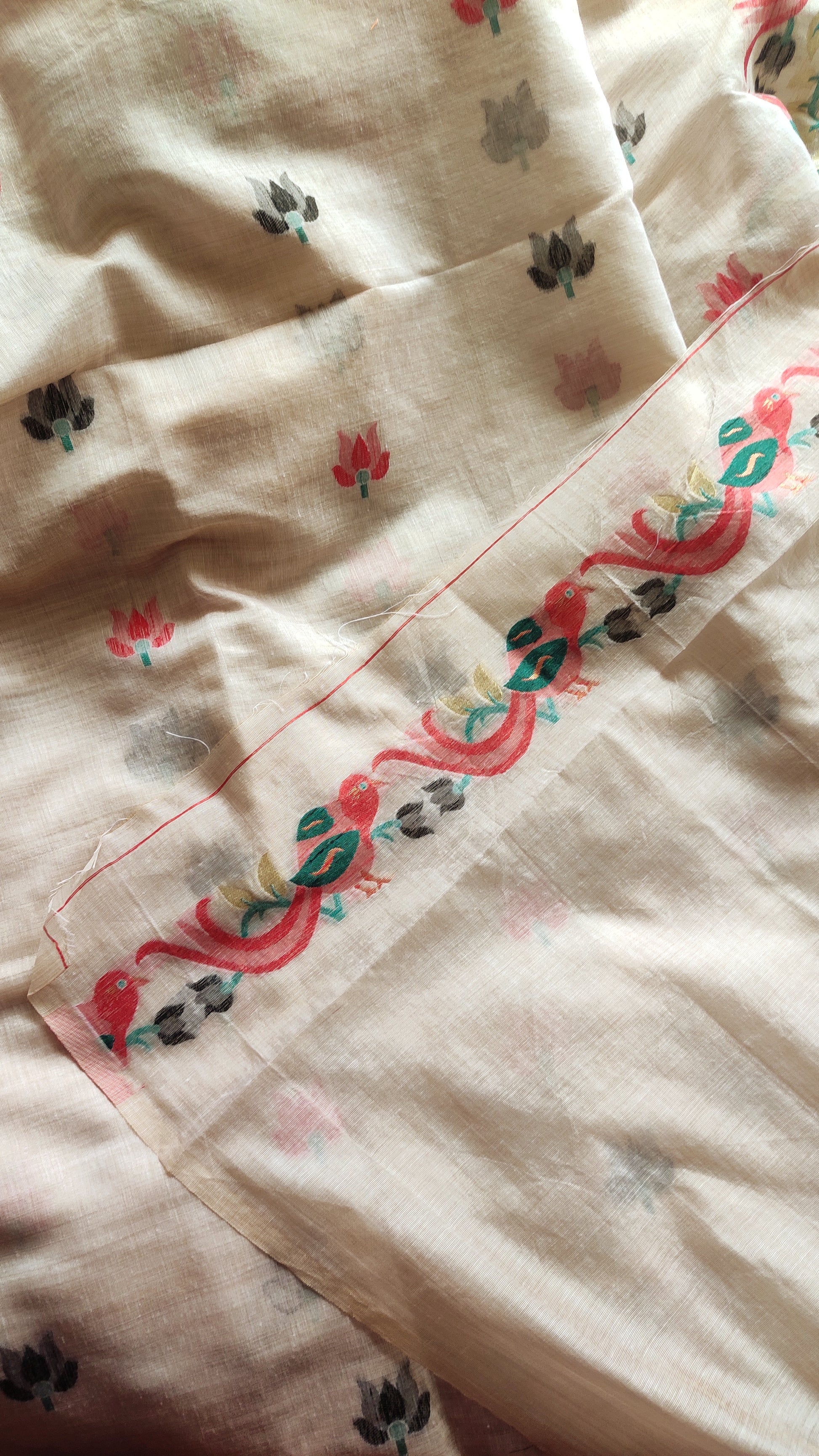This exquisite Tussar saree features a natural Tussar-colored base adorned with vibrant multicolored threaded birds and intricate floral jamdani motifs. Crafted from premium tussar silk, it combines traditional artistry with elegant design, making it a refined choice for special occasions. The detailed motifs enhance its visual appeal while maintaining the fabric’s natural texture and sheen. Perfect for those who appreciate heritage craftsmanship and timeless style.