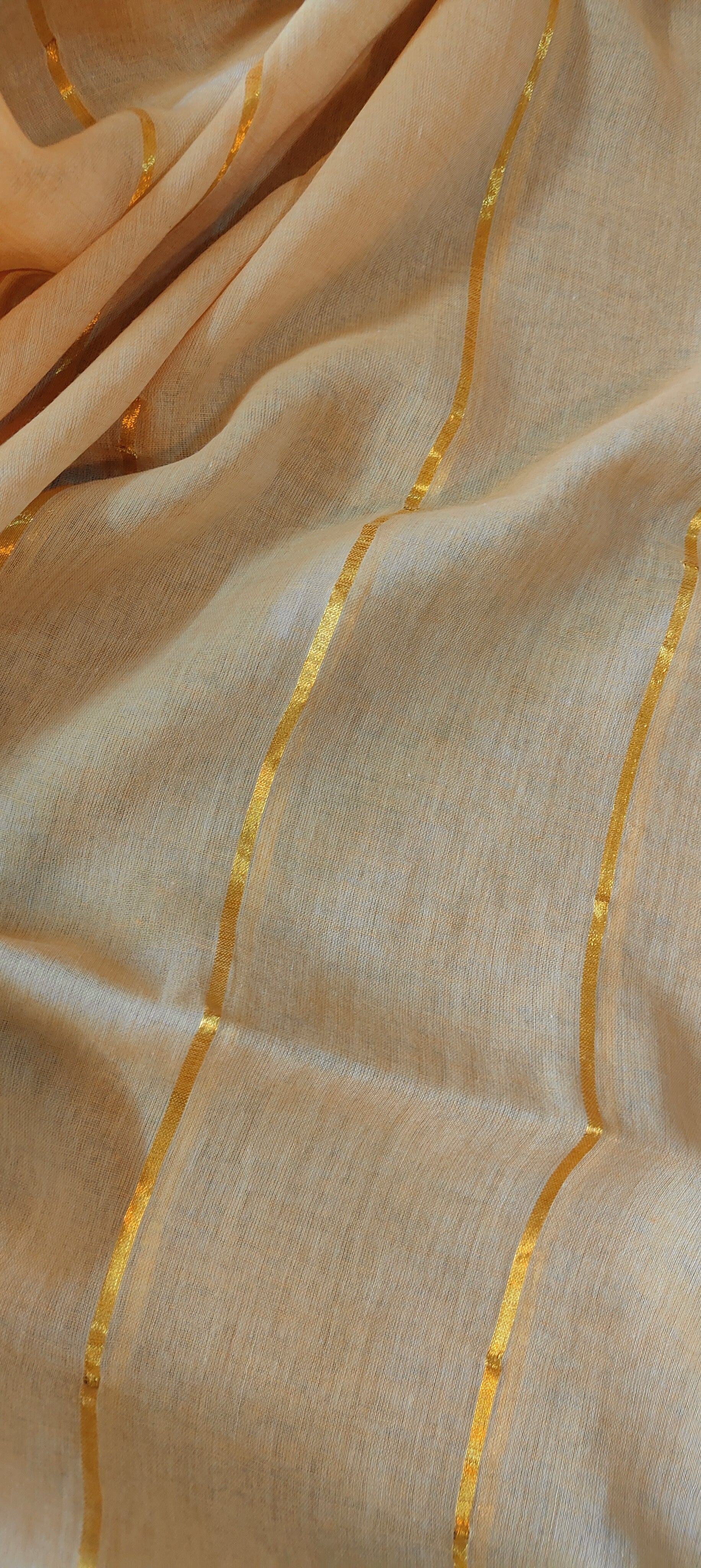 This cream mulmul cotton saree features a subtle single-color design enhanced with elegant zari stripes, combining traditional craftsmanship with contemporary simplicity. Its breathable cotton fabric ensures comfort for all-day wear, while the zari detailing adds a refined touch suitable for both casual and formal occasions. Ideal for those seeking a timeless and versatile addition to their wardrobe.