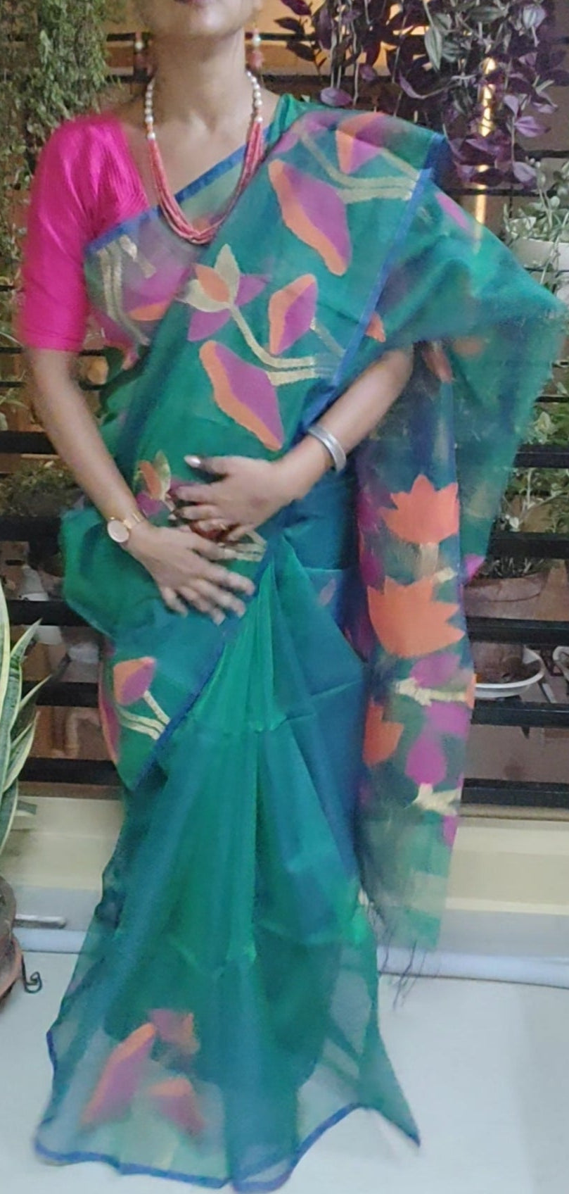 Discover the refined elegance of this dual-shaded peacock green jamdani, meticulously handwoven from soft muslin. Each piece showcases intricate threaded floral motifs adorning the border and pallu, while delicate buttas are scattered gracefully across the body. This traditional weave exemplifies authentic craftsmanship, blending heritage techniques with sophisticated color gradation. Perfect for those who appreciate artisanal textiles and timeless design.