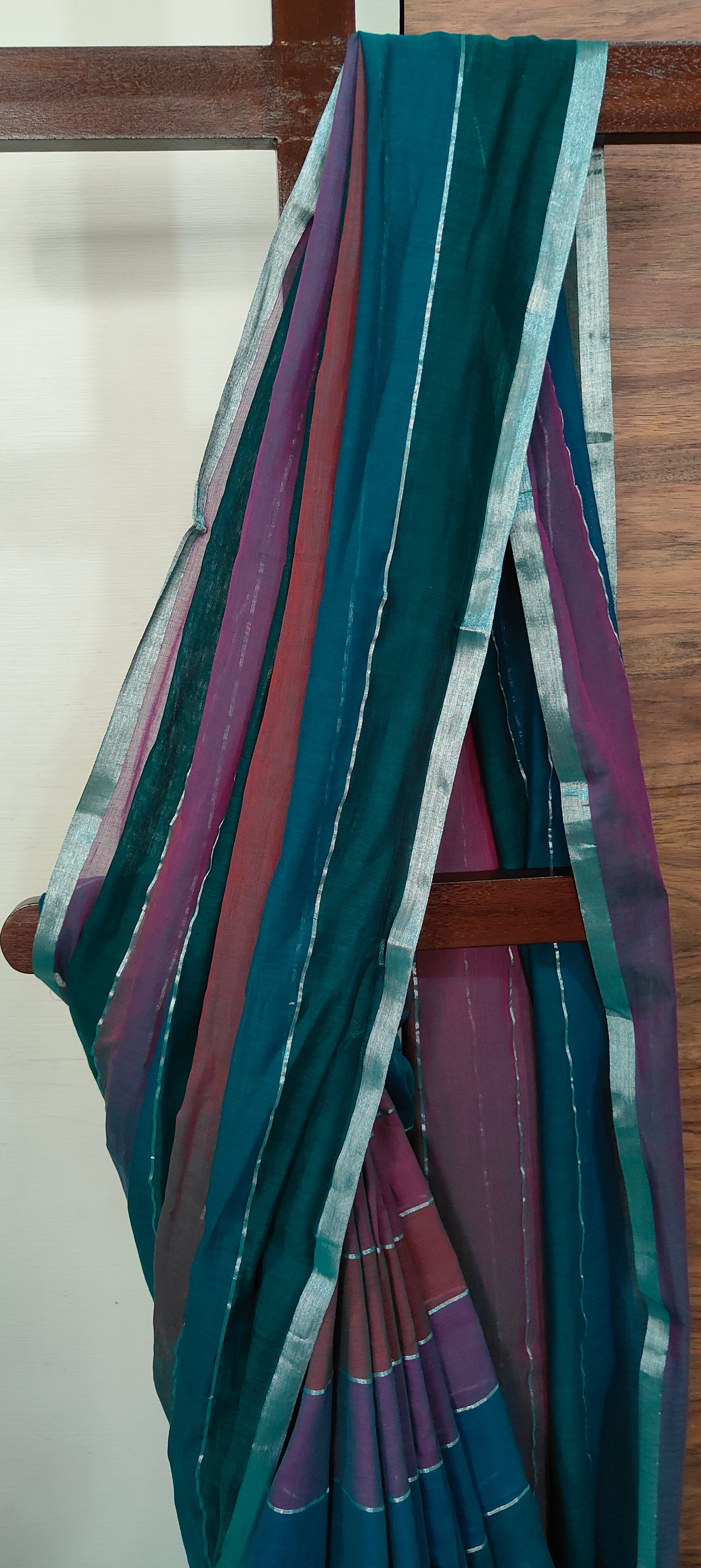This Multi colored mulmul cotton saree features a subtle design enhanced with elegant silver zari stripes, combining traditional craftsmanship with contemporary simplicity. Its breathable cotton fabric ensures comfort for all-day wear, while the zari detailing adds a refined touch suitable for both casual and formal occasions. Ideal for those seeking a timeless and versatile addition to their wardrobe.