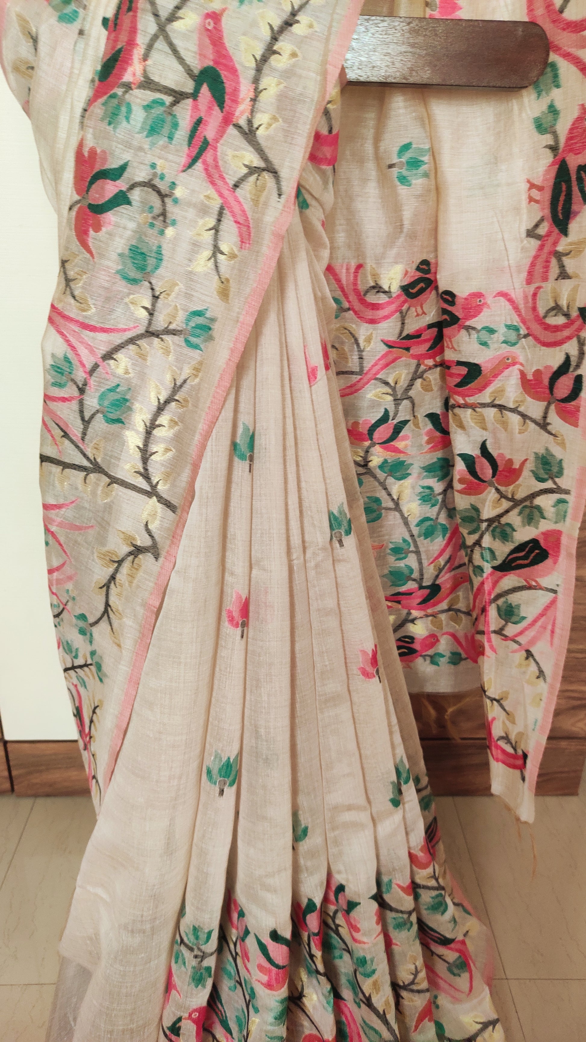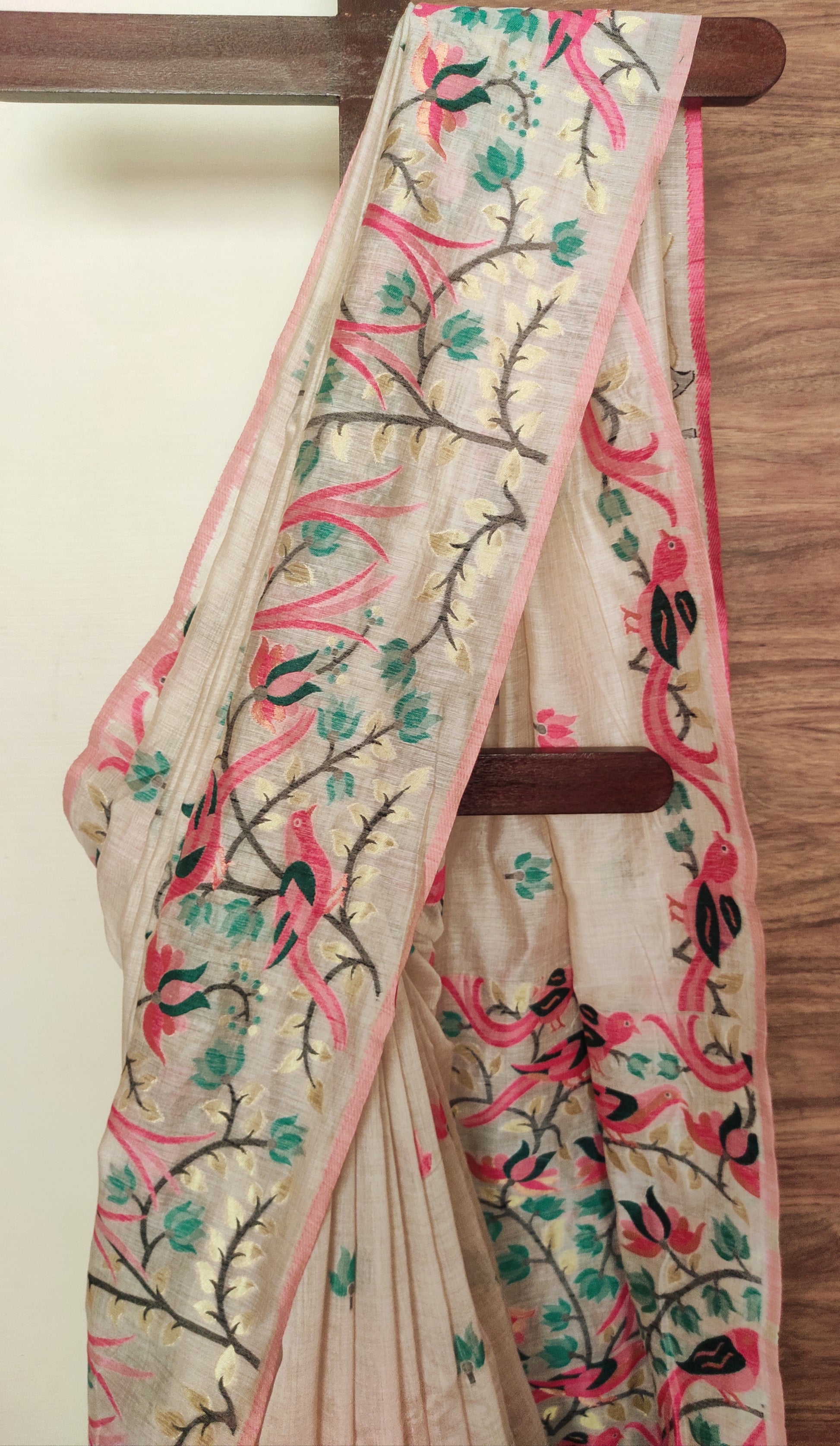This exquisite Tussar saree features a natural Tussar-colored base adorned with vibrant multicolored threaded birds and intricate floral jamdani motifs. Crafted from premium tussar silk, it combines traditional artistry with elegant design, making it a refined choice for special occasions. The detailed motifs enhance its visual appeal while maintaining the fabric’s natural texture and sheen. Perfect for those who appreciate heritage craftsmanship and timeless style.