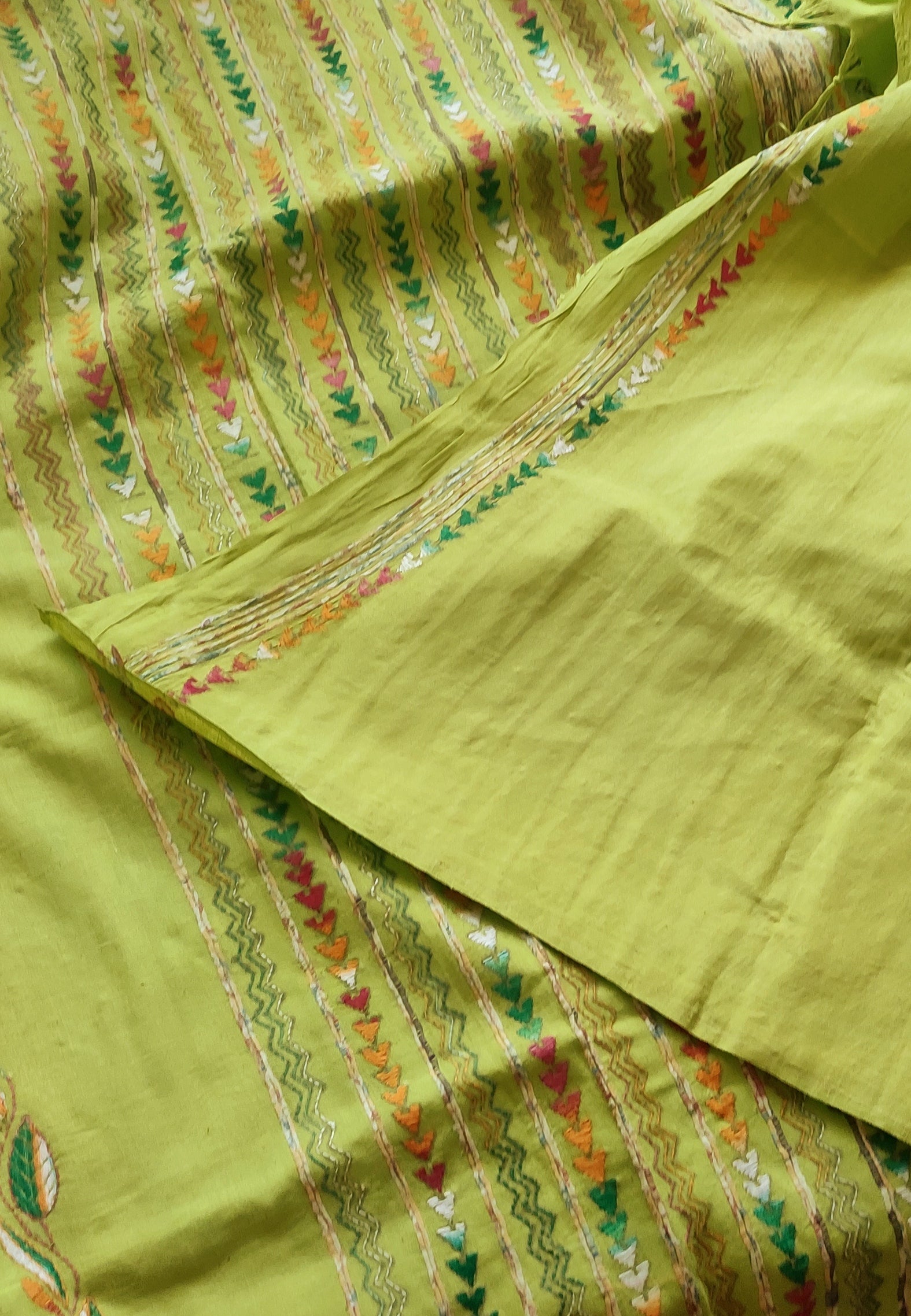 Handmade Kantha Stitch Done Pista Green Khesh Cotton Saree