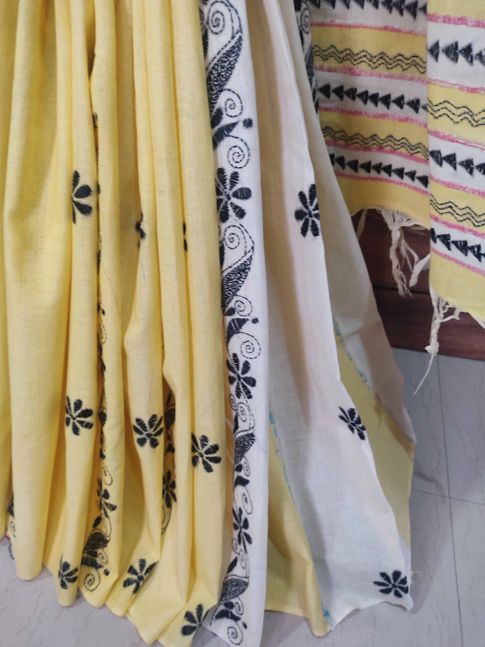 This Yellow-White Khesh Cotton Saree features exquisite handmade Kantha stitching, showcasing traditional craftsmanship with a modern touch. The Patuli Pallu adds elegance, while the breathable cotton fabric ensures comfort throughout the day. Ideal for those who appreciate artisanal detail and timeless style in their wardrobe.