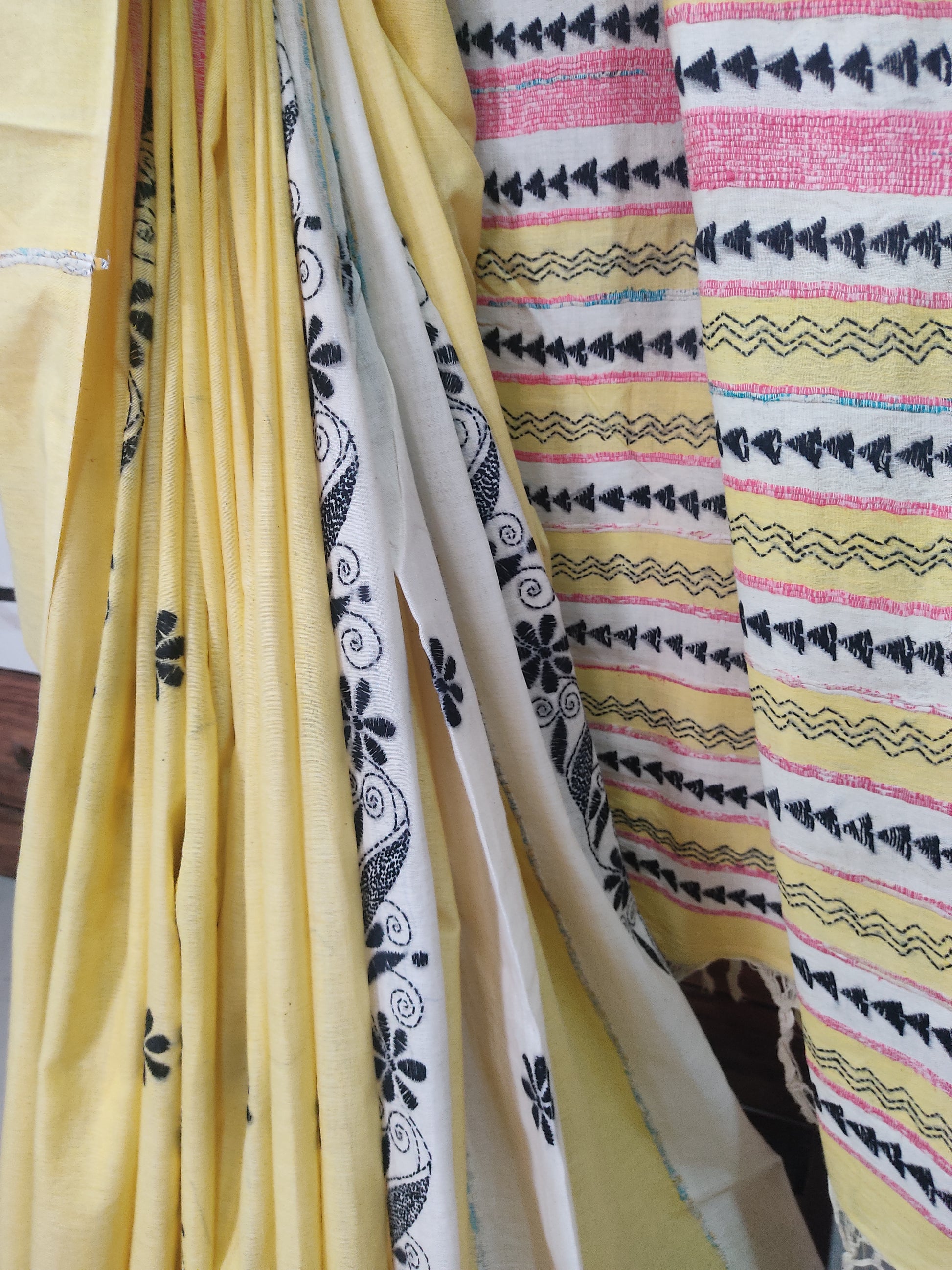 Handmade Kantha Stitch done Yellow-White Khesh Cotton Patuli Pallu Saree