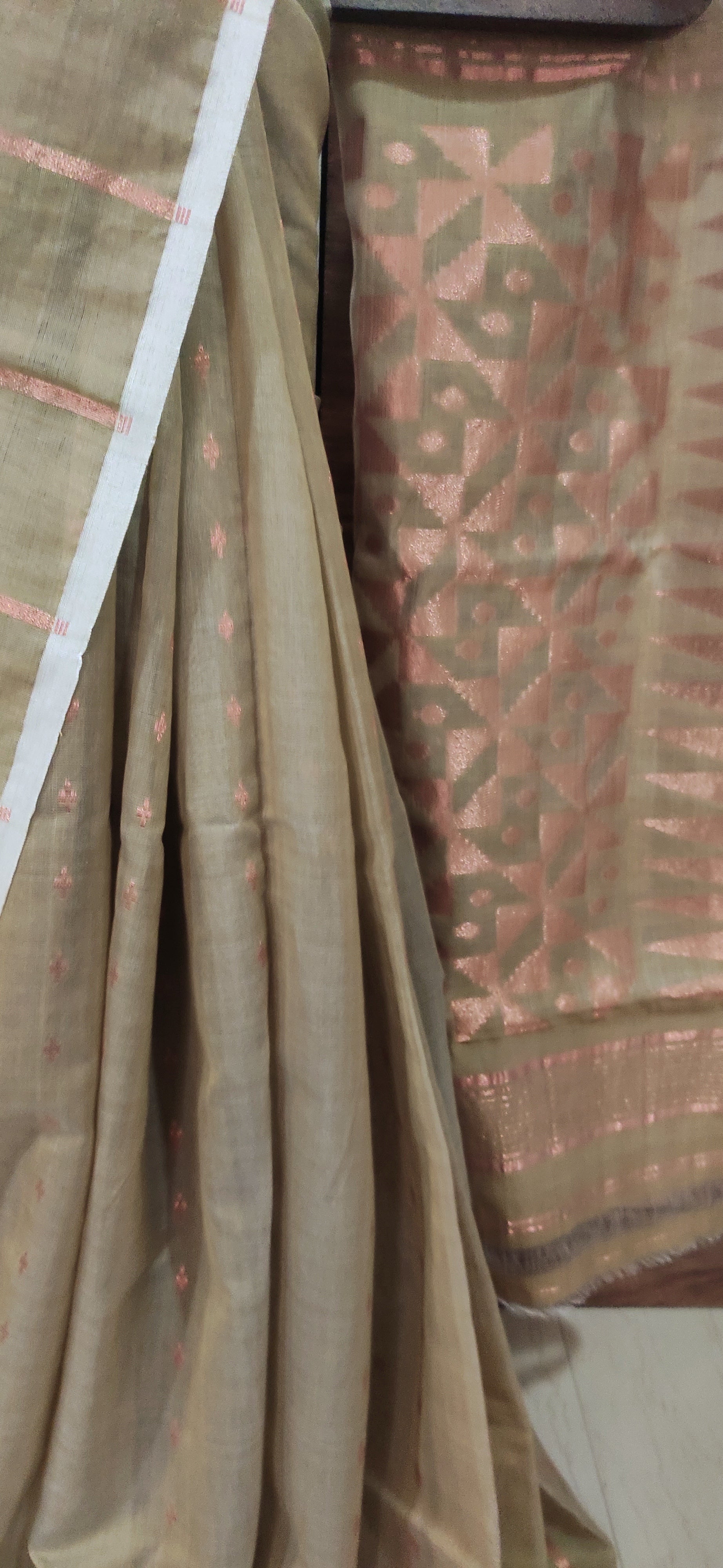 Jamdani Inspired Mud Green Silk Cotton Copper Zari Worked handloom Saree