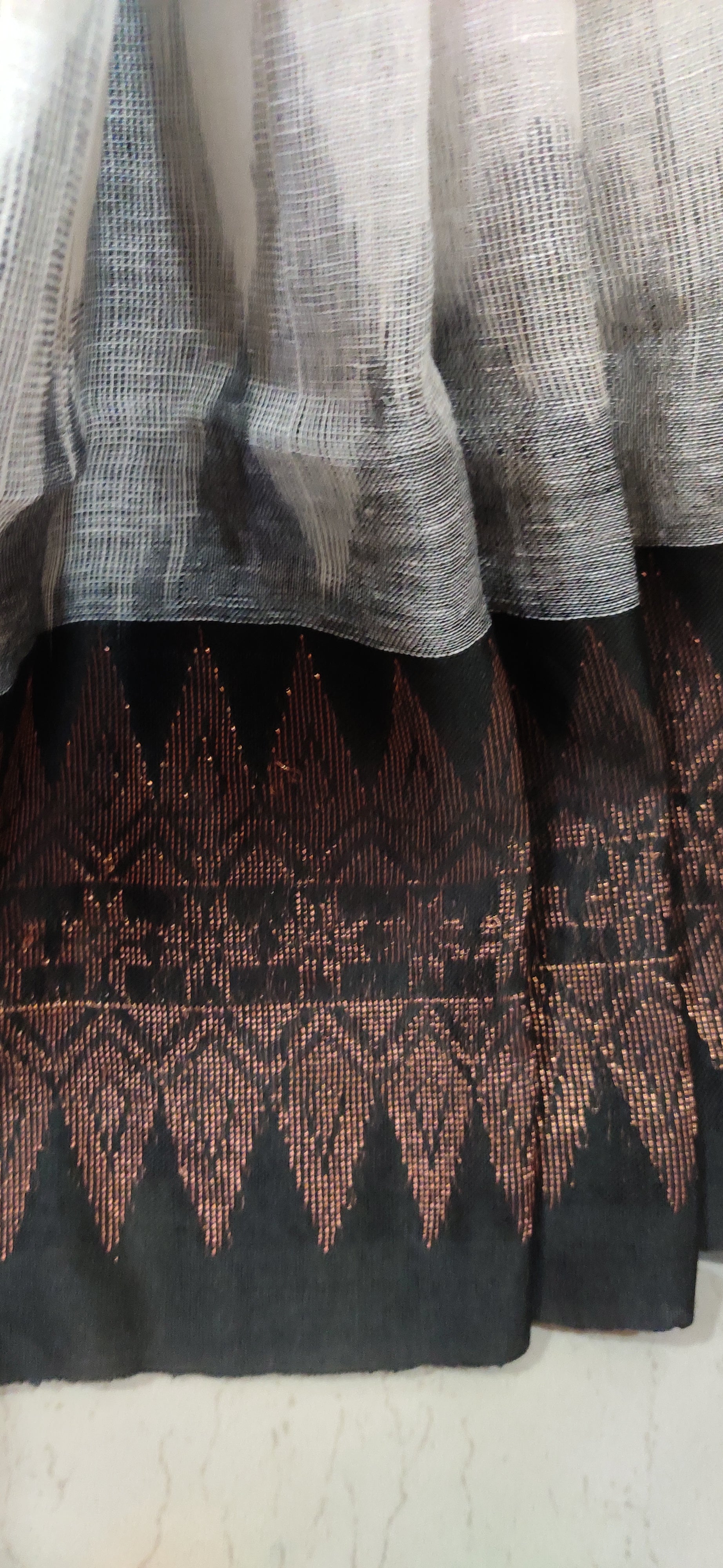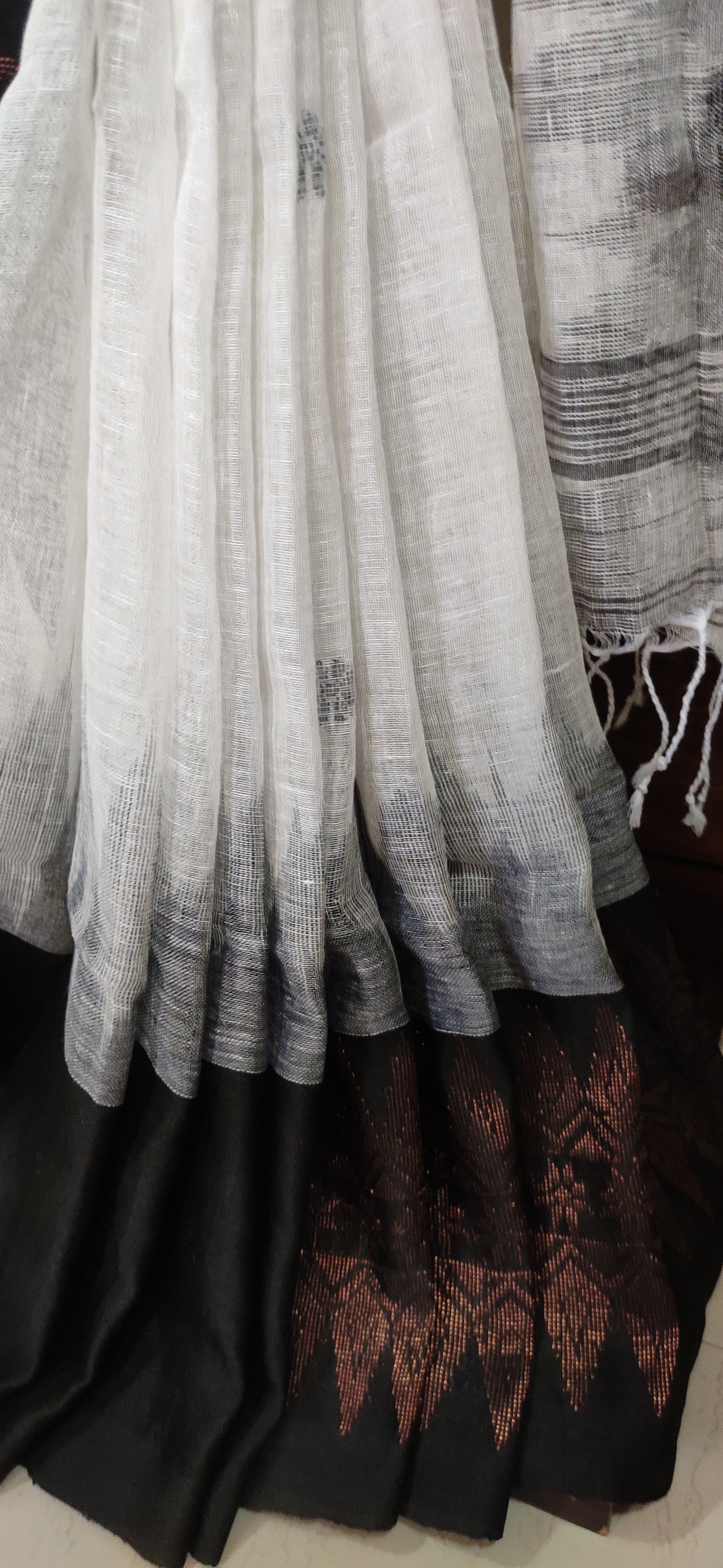This elegant saree features a white linen ikkat blend, enhanced with intricate zari work on striking black border. The combination of traditional ikkat patterns and delicate zari detailing offers a refined look, perfect for formal occasions or festive celebrations. Crafted to provide both comfort and style, it reflects expert craftsmanship and timeless appeal.