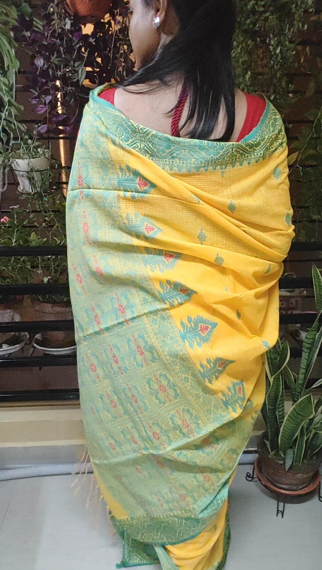 Expertly hand-woven from soft Mercerised Cotton, this bright Yellow Jamdani Inspired Handloom Saree features a traditional kota style jaal weave on the body, adorned with elegant contrast green Jamdani motifs on the border and pallu. With scattered buttas throughout, this saree exudes timeless sophistication and comfort.