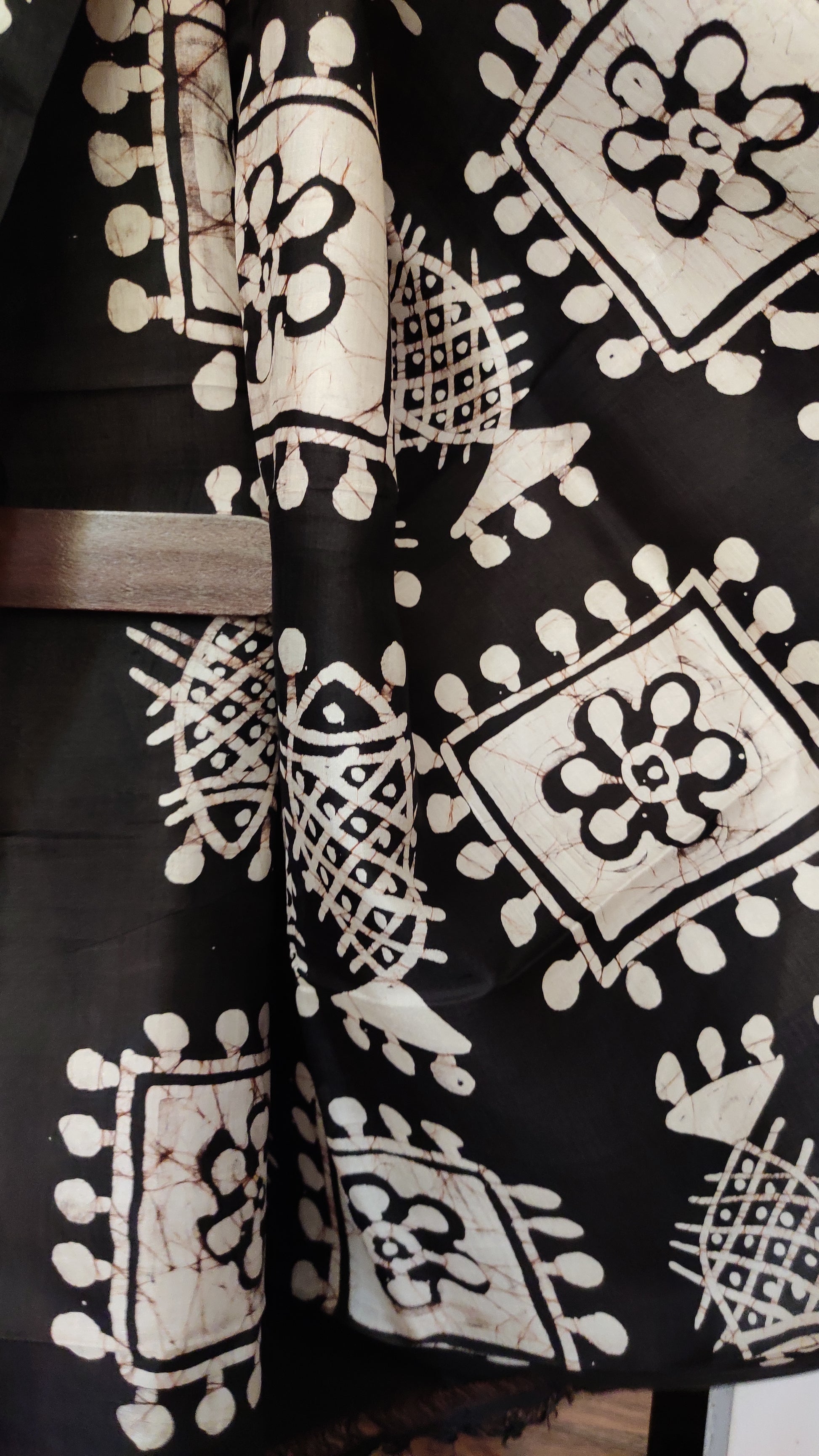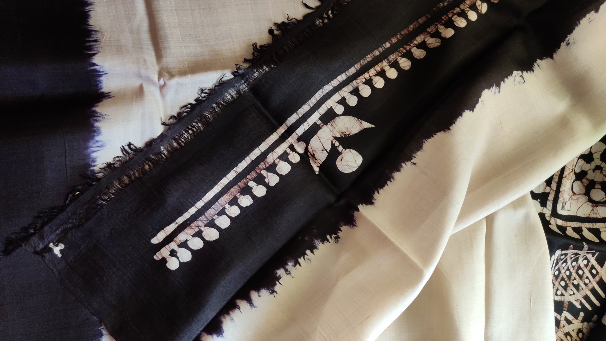 Off White - Black hand Batik Pure Silk Saree having fish design