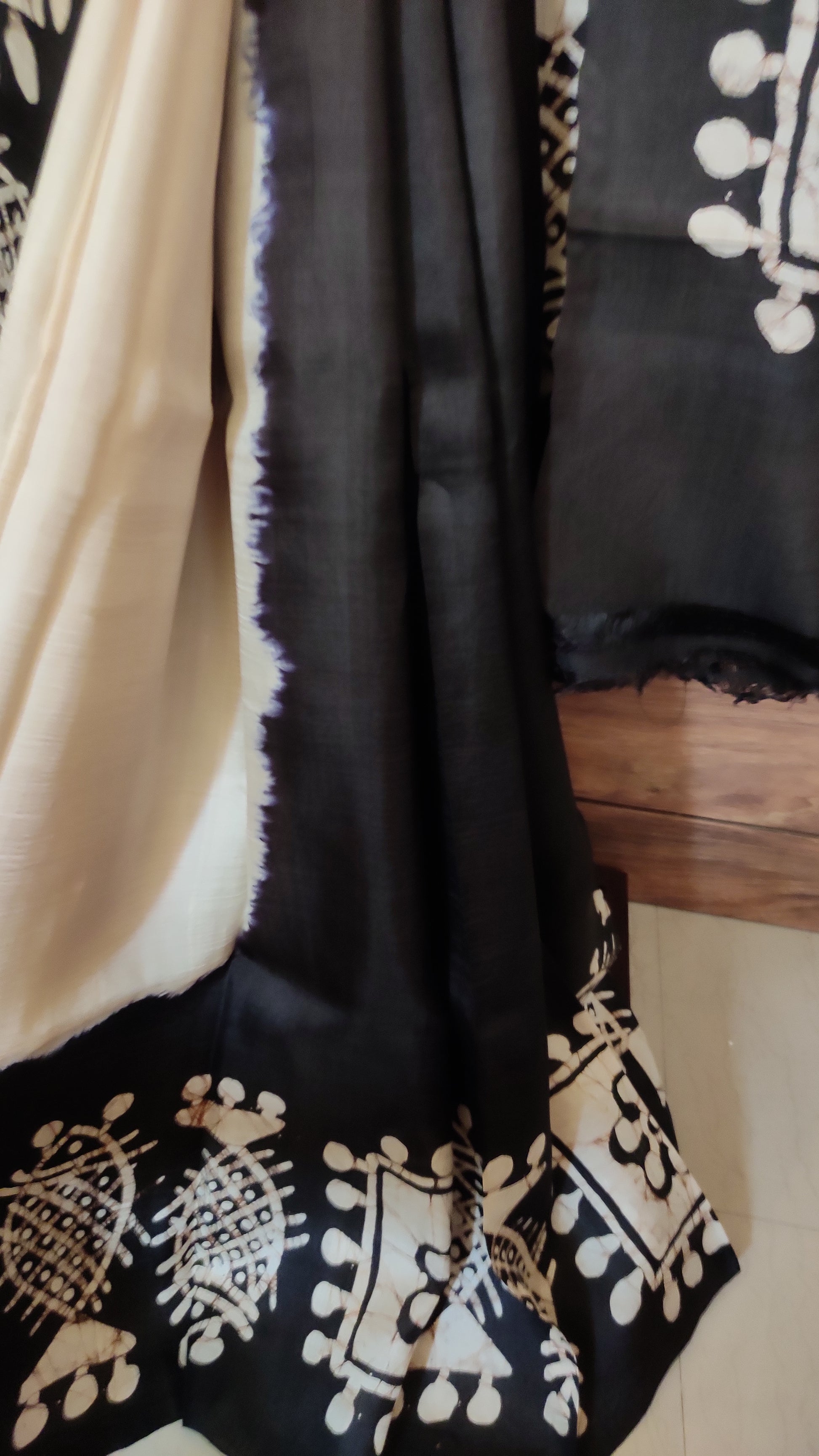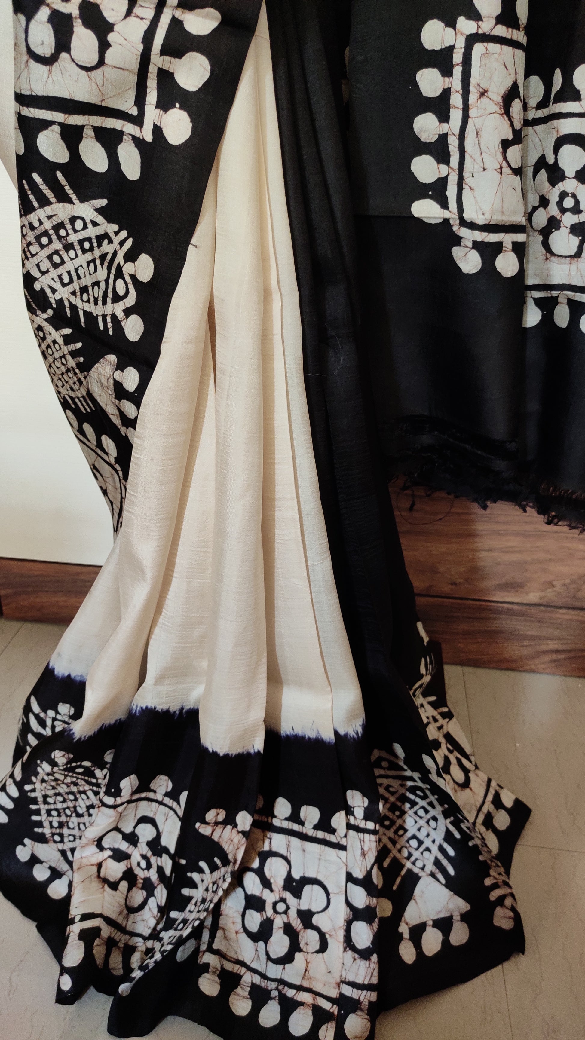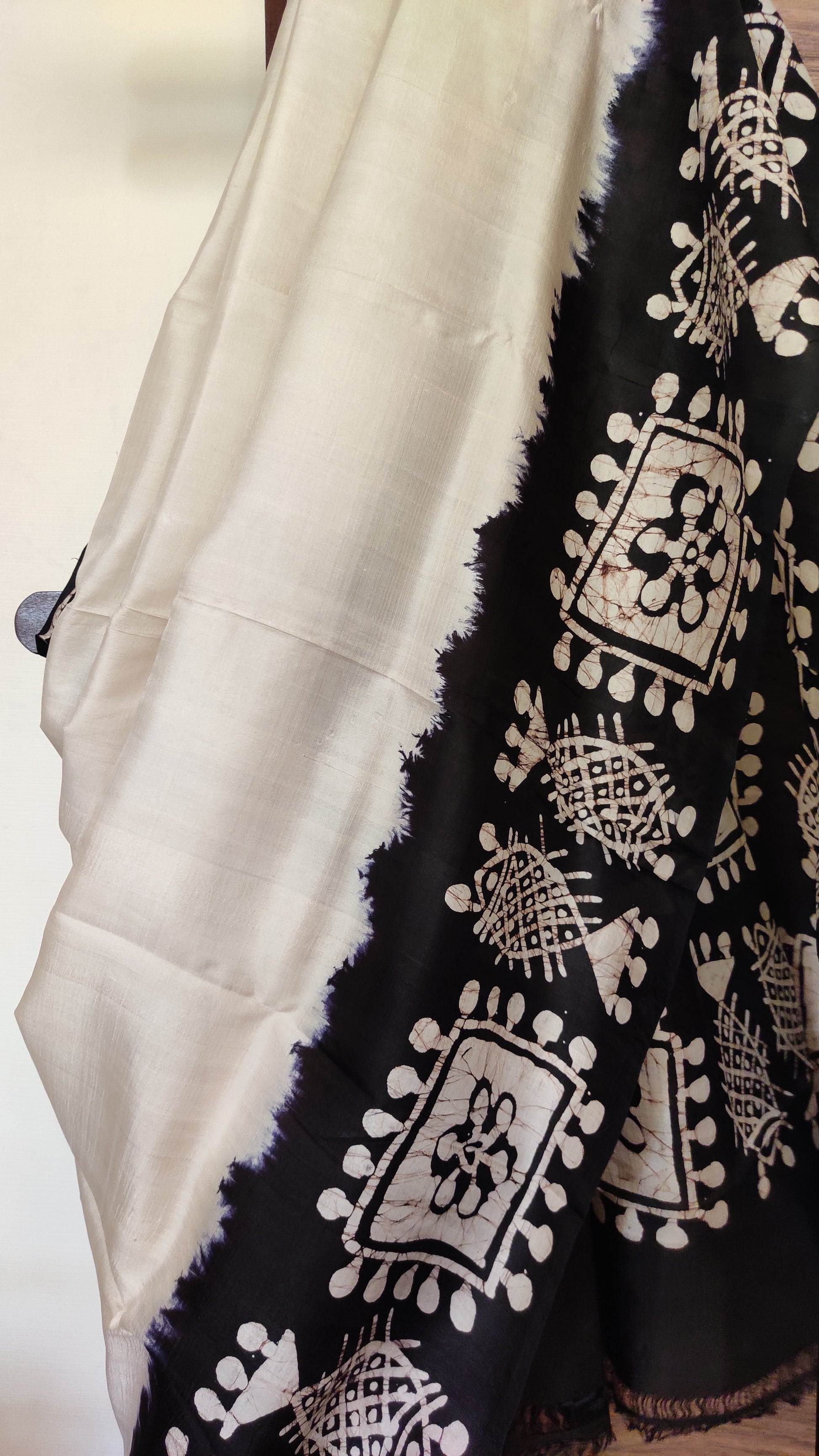 This exquisite off-white saree is crafted from pure silk, featuring delicate hand batik work that highlights black border having fish motifs done.