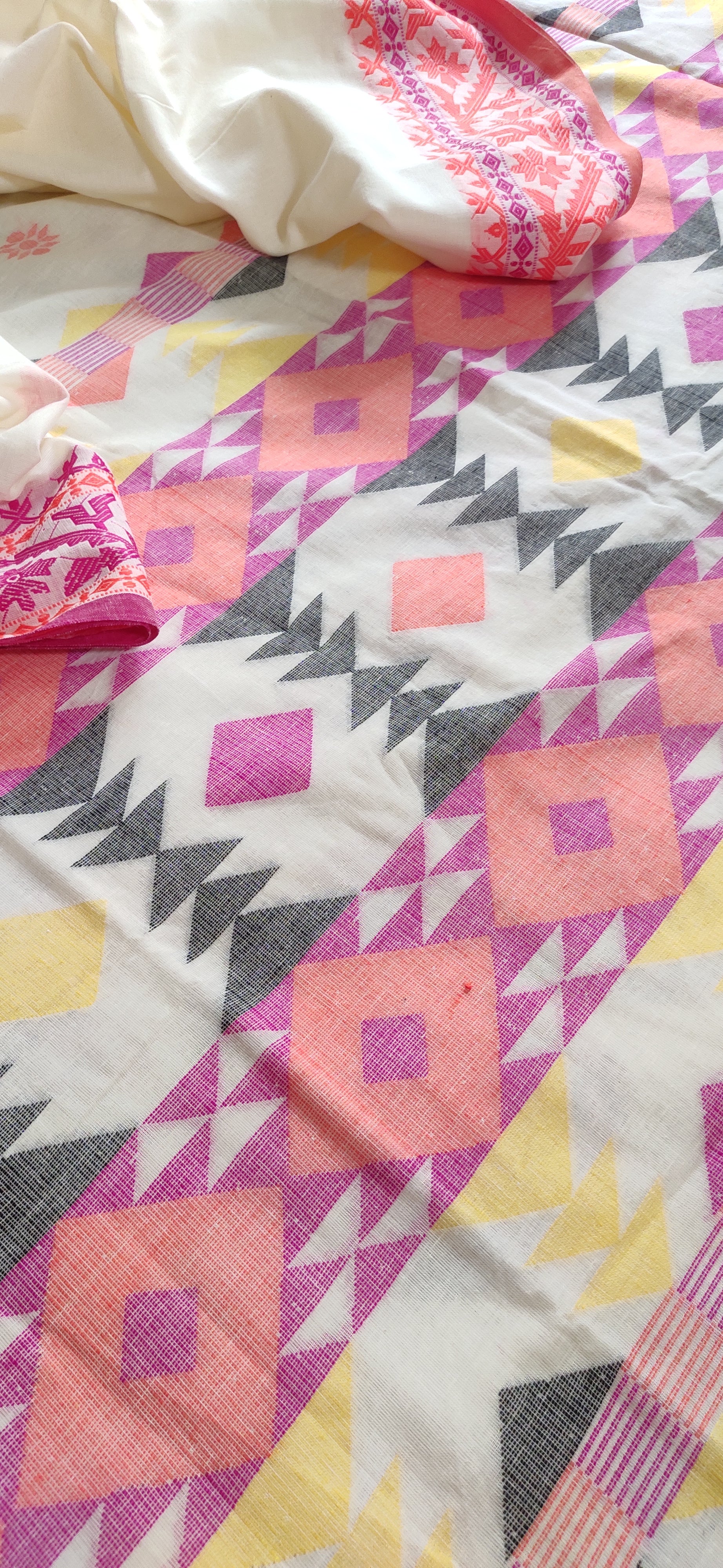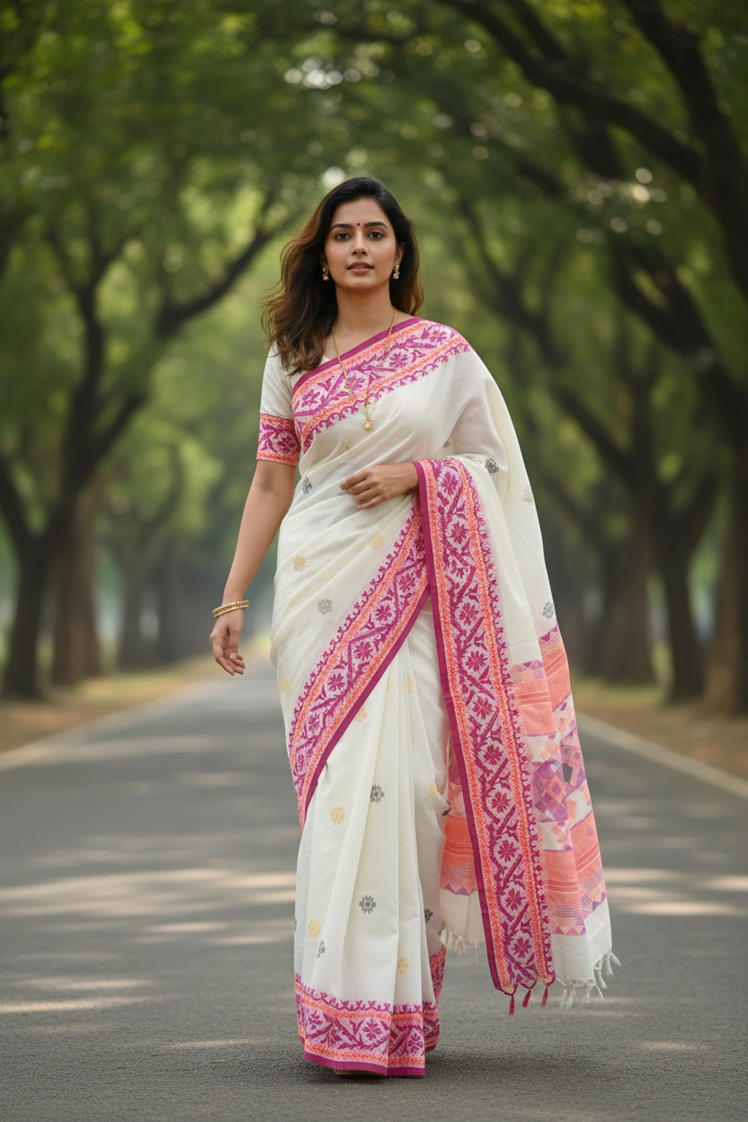 Experience the refined sophistication of this gorgeous Off-White handloom saree with beautiful thread work, woven from pure cotton with an exceptionally soft hand-feel. Featuring exquisite jamdani-style threadwork, the saree showcases an ornate motif gracing the border and pallu and small buttas all over the body. Each piece reflects authentic Bengal handloom heritage, combining traditional weaving techniques with a contemporary color palette. Ideal for discerning wearers who appreciate artisanal craftsmanship and timeless design.