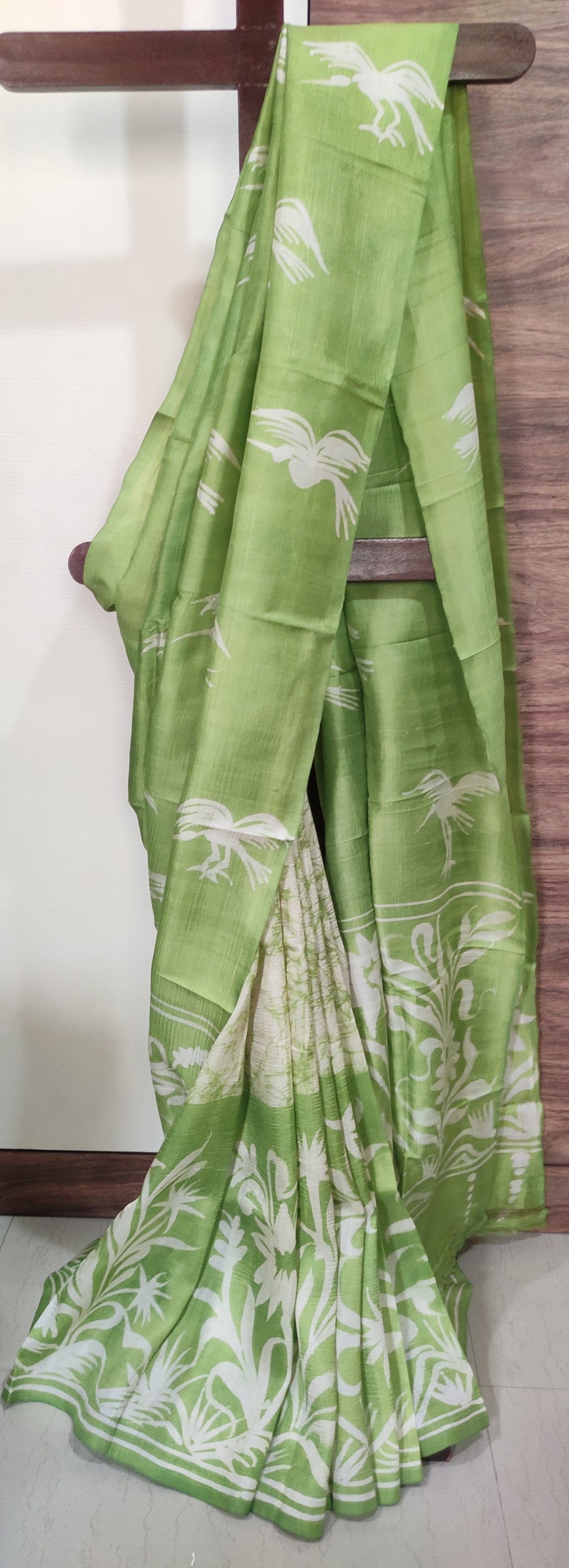 Flying Bird Light Green Hand Batik Pure Silk Saree
