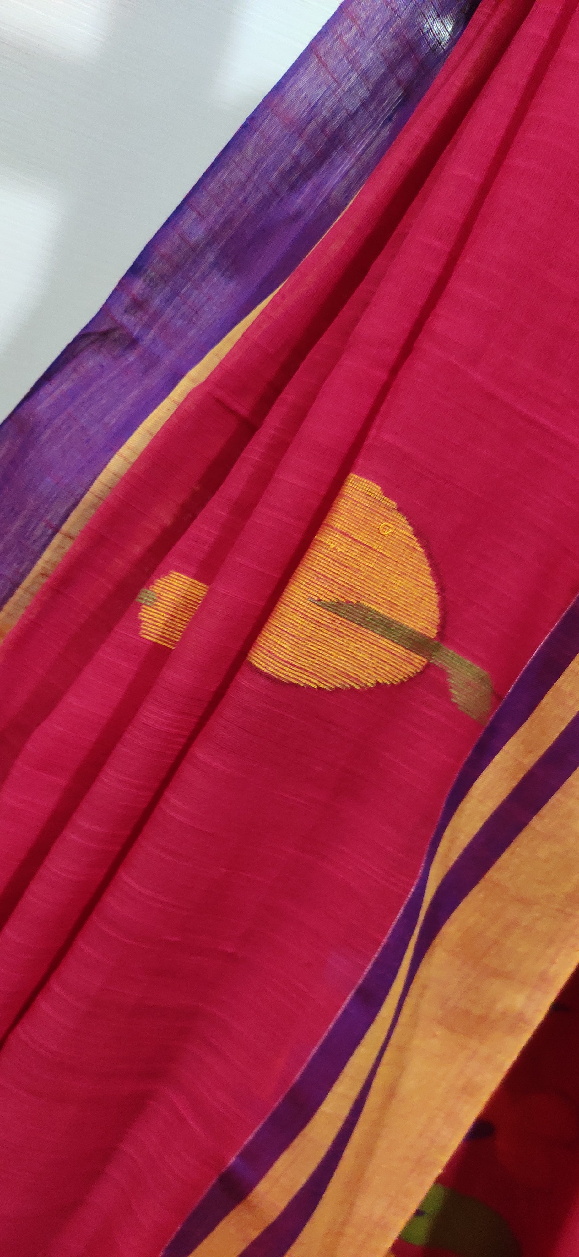 Drape yourself in timeless elegance with this handspun slab cotton Jamdani saree, meticulously crafted using traditional handloom techniques. Woven from buttery-soft fine muslin cotton, this piece showcases exquisite artistry with delicate floral motifs adorning the pallu and scattered buttas throughout the body. The contrast thin border adds refined definition to this classic silhouette. Perfect for those who appreciate authentic craftsmanship and understated luxury, this saree seamlessly transitions from everyday wear to special occasions, celebrating the heritage of Bengal's finest textile traditions.