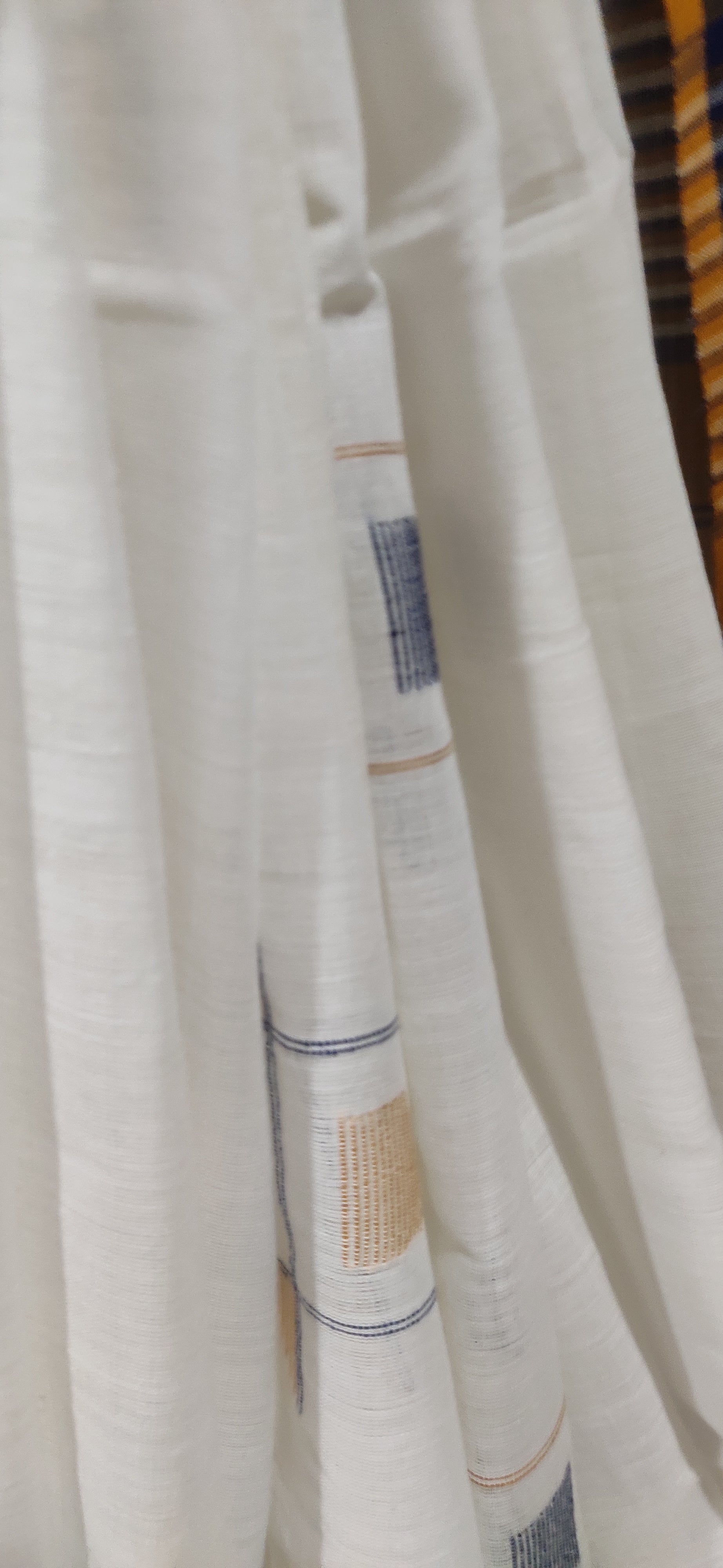 Discover understated elegance in this handloom khadi saree, where a geometric tic-tac-toe motif in contrasting threads creates visual rhythm across off white fabric. Crafted on traditional handlooms, this piece balances minimalist design with textural depth—ideal for those who appreciate refined, contemporary takes on classic weaving. The natural khadi weave offers breathable comfort, while the bordered finish adds definition. A versatile choice for both casual and semi-formal occasions.
