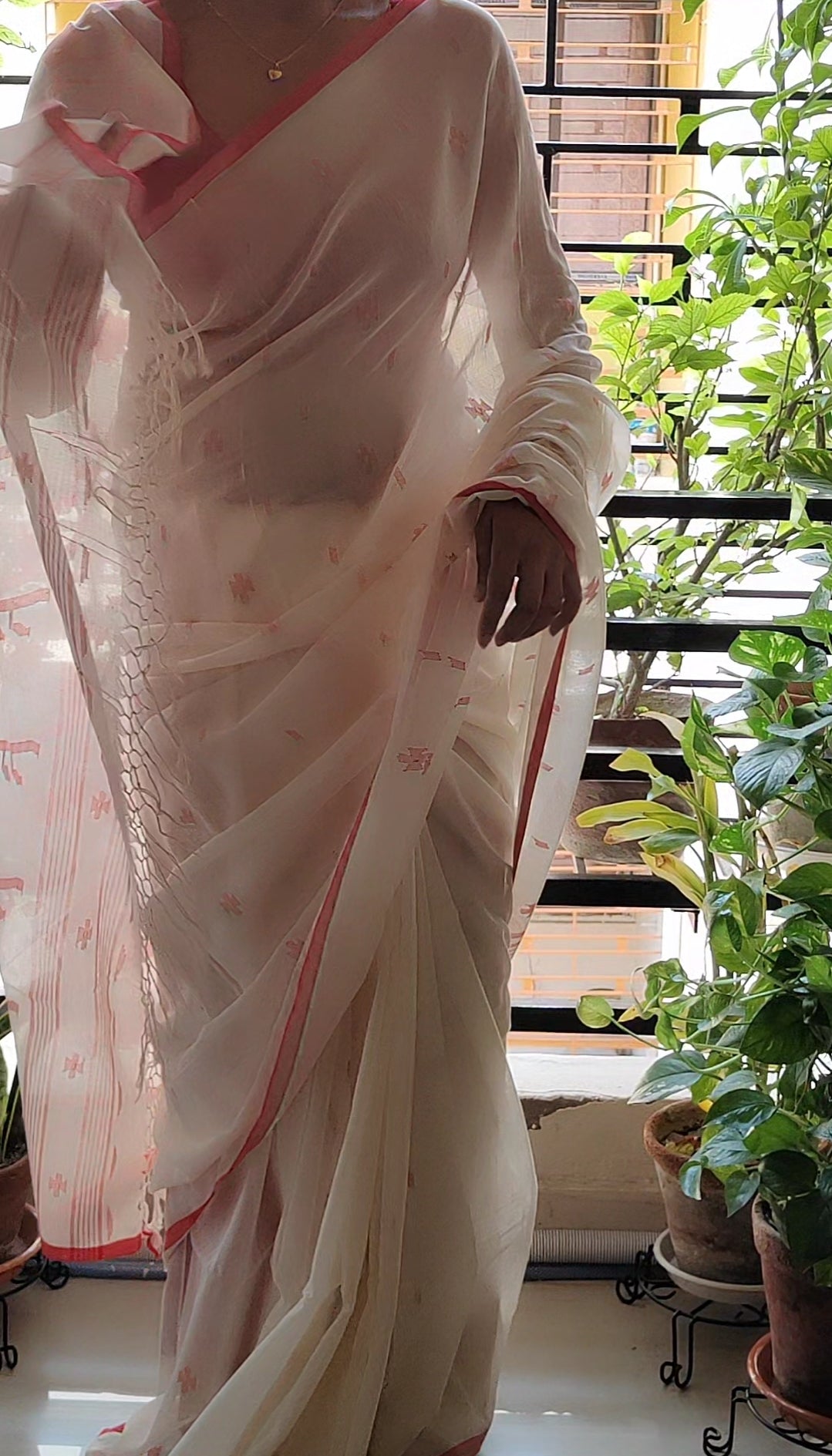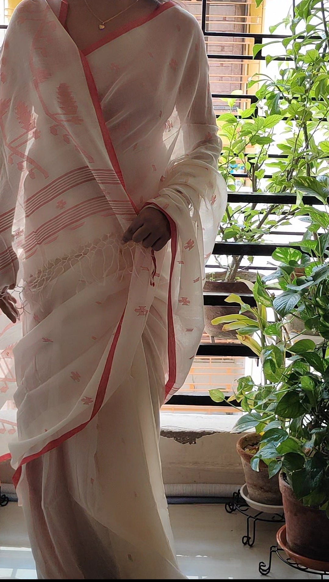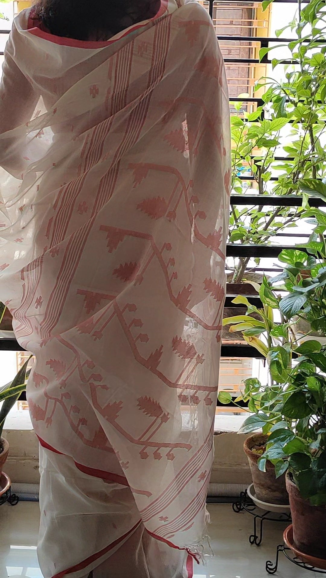 White Handspun Pure Cotton jamdani with red selvedge border Saree