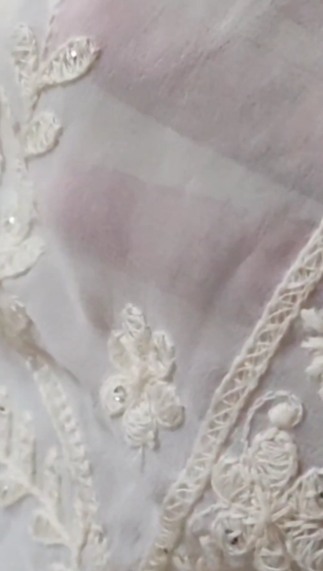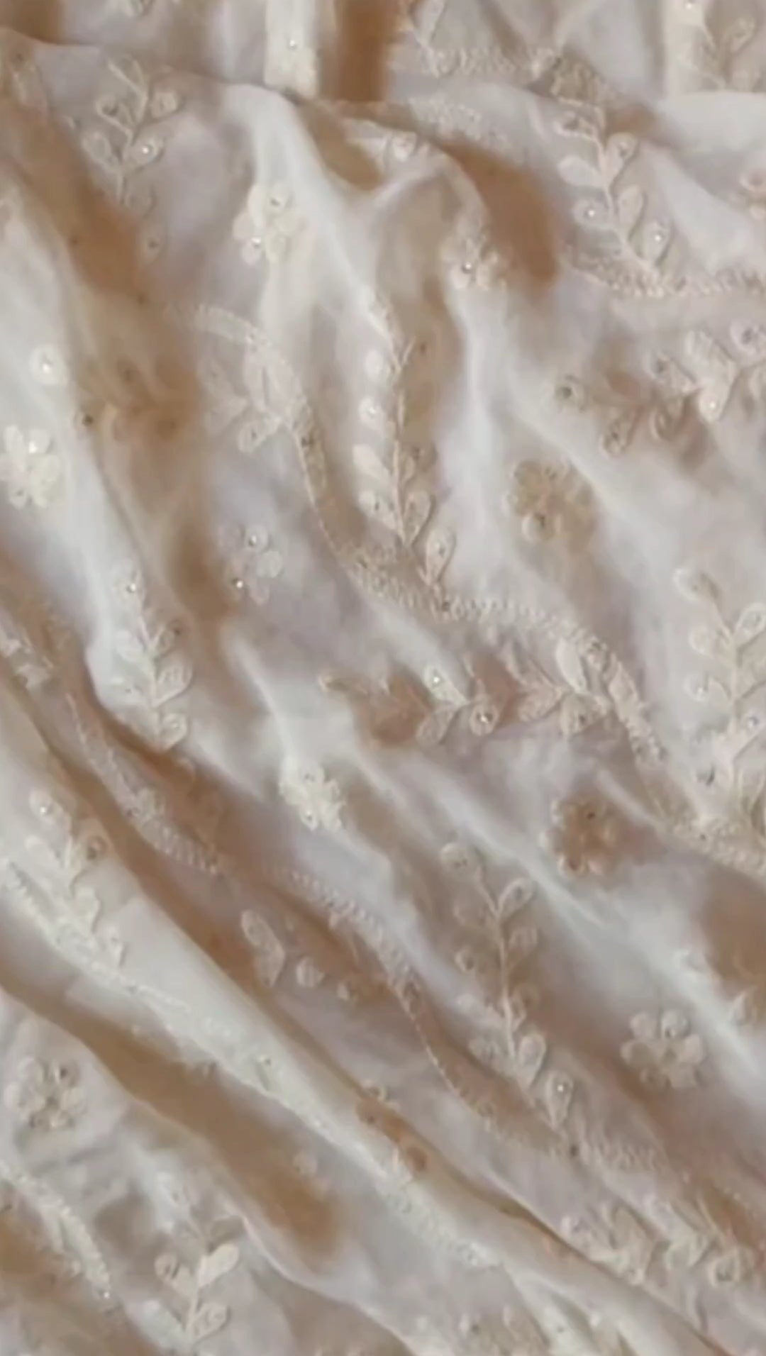 This elegant white chiffon saree features exquisite Lucknow Chikankari embroidery, showcasing intricate design patterns that highlight traditional craftsmanship. Lightweight and breathable, it offers graceful draping and a refined look, perfect for formal occasions or cultural celebrations. The delicate detailing enhances its timeless appeal, making it a sophisticated addition to any wardrobe.